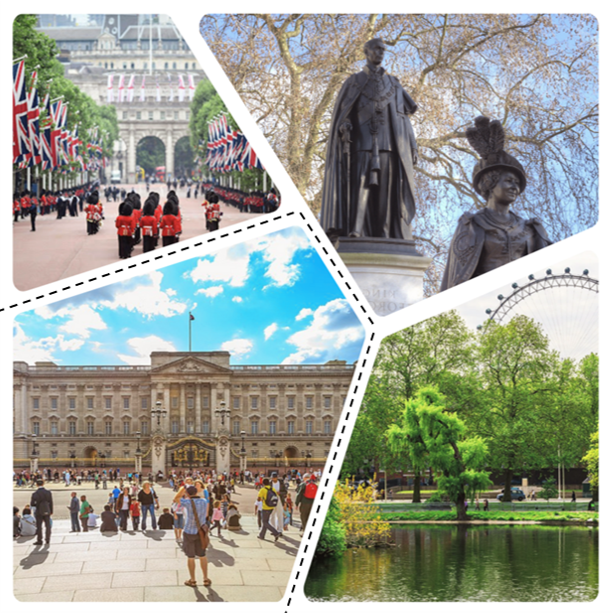Centred around the palace, The Mall and monuments in the adjoining park famous for hosting royal ceremonies. Followed by food and drink.